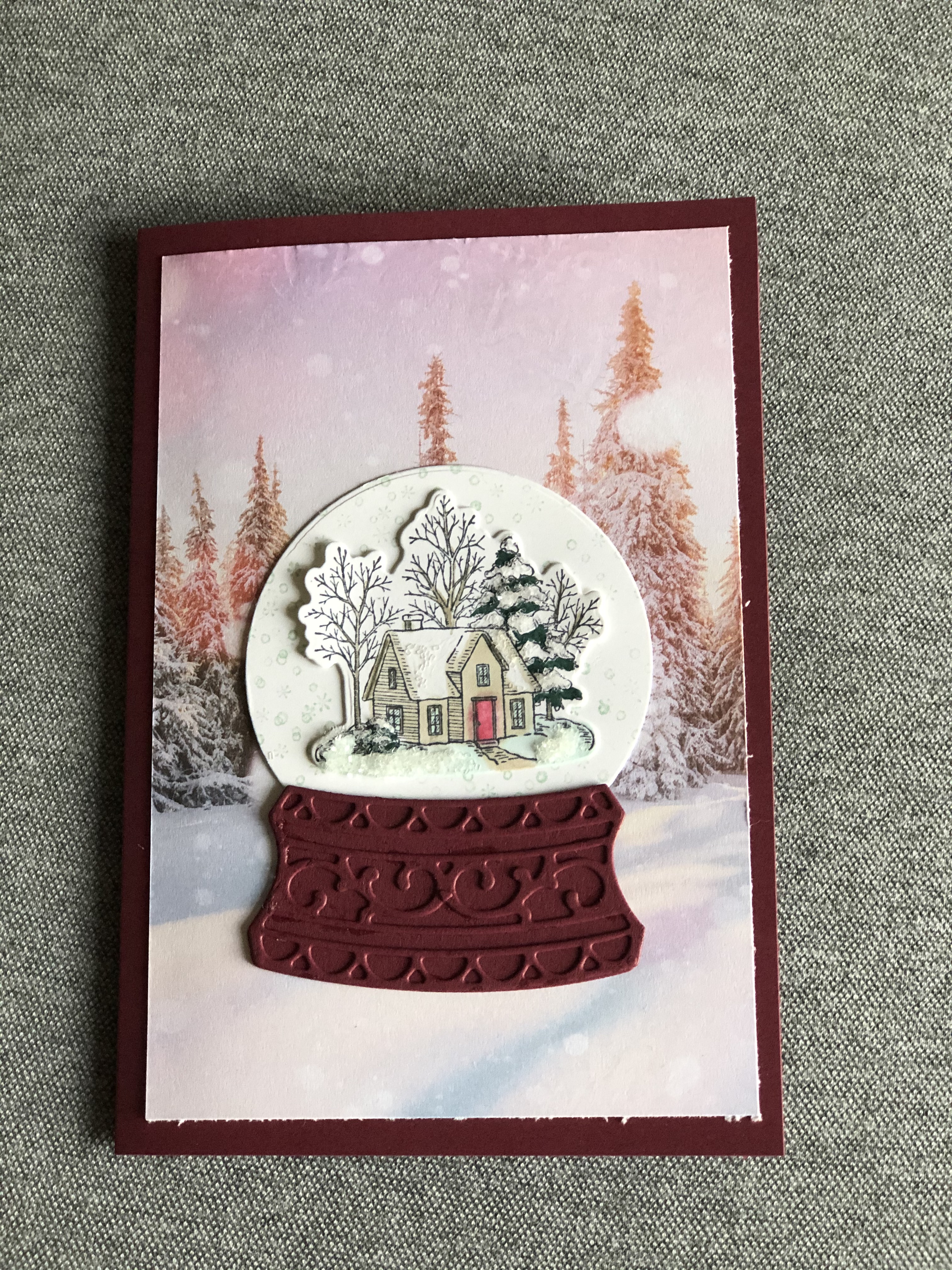 Ensuite, j’ai utilisé papiers unis de couleurs différentes, le papier de la série design manteau de givre, les tampons still scenes et les poinçons scène de boule de neige.