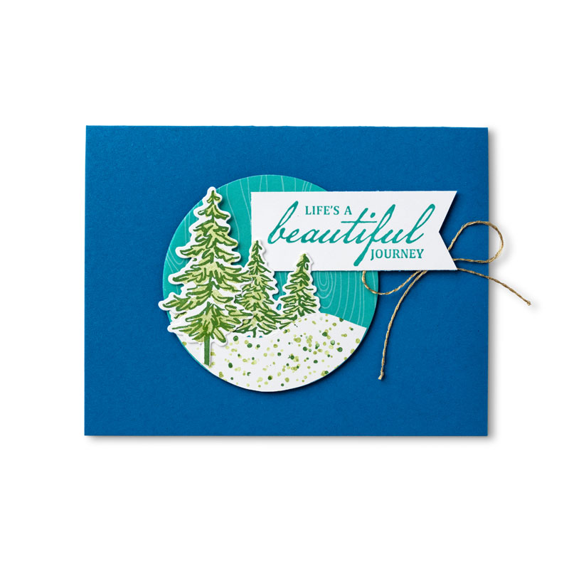 Lot In the Pines ; set de tampons Merveilleux voyage ; papier cartonné Murmure blanc et Pointe Pacifique ; papier de la série Design 6″ x 6″ (15,2 x 15,2 cm) Brillants ; tampons encreurs Classic Baie des Bermudes et Vert jardin ; méli-mélo de ruban Feuillages infinis ; Stampin’ Dimensionals ; poinçons Pyramide de cercles
