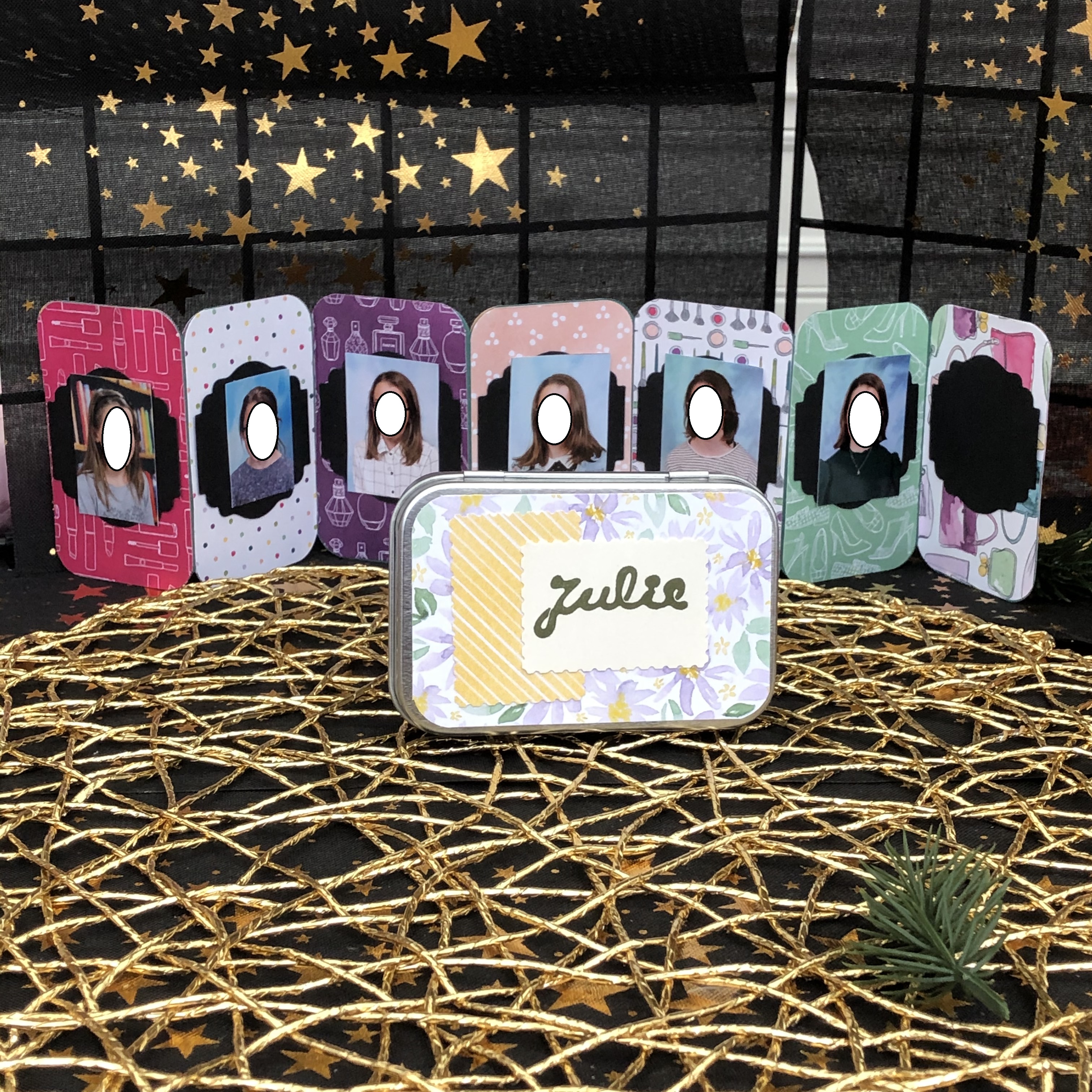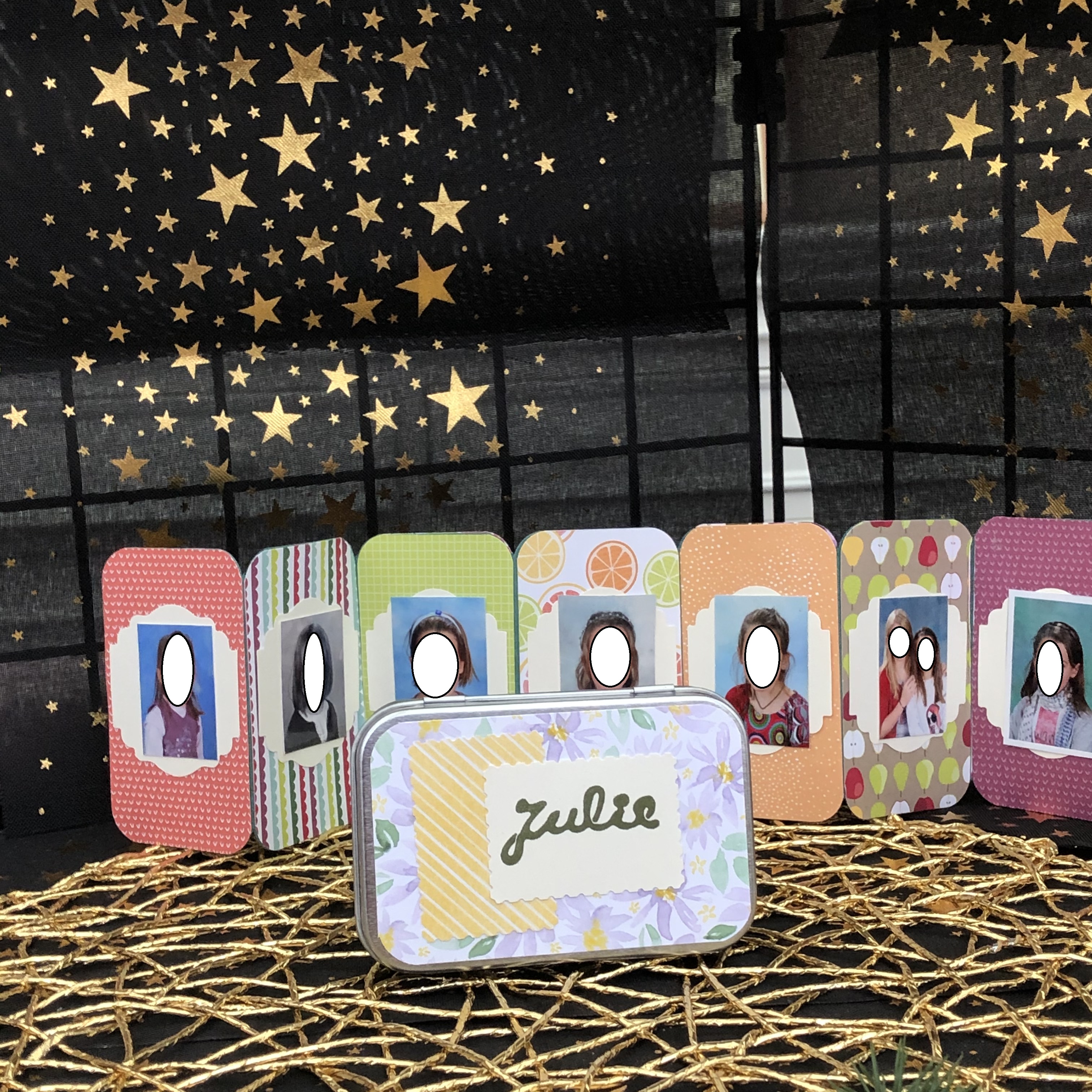 Aujourd’hui je vous présente un mini album tout mini à ranger dans une superbe boîte en étain. Ce mini est idéal pour un cadeau avec toutes les photos des années école ou collège ou lycée.