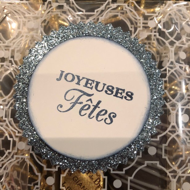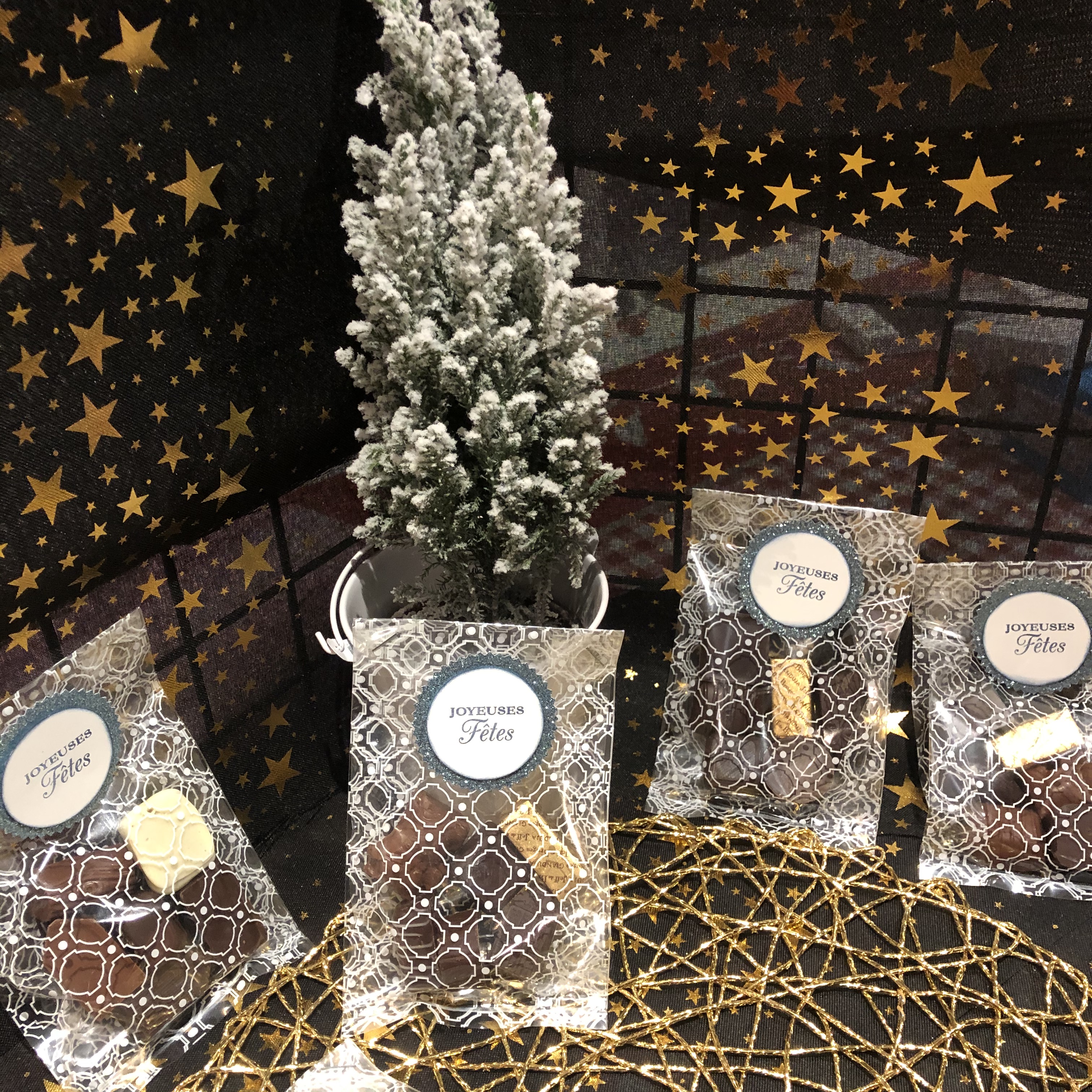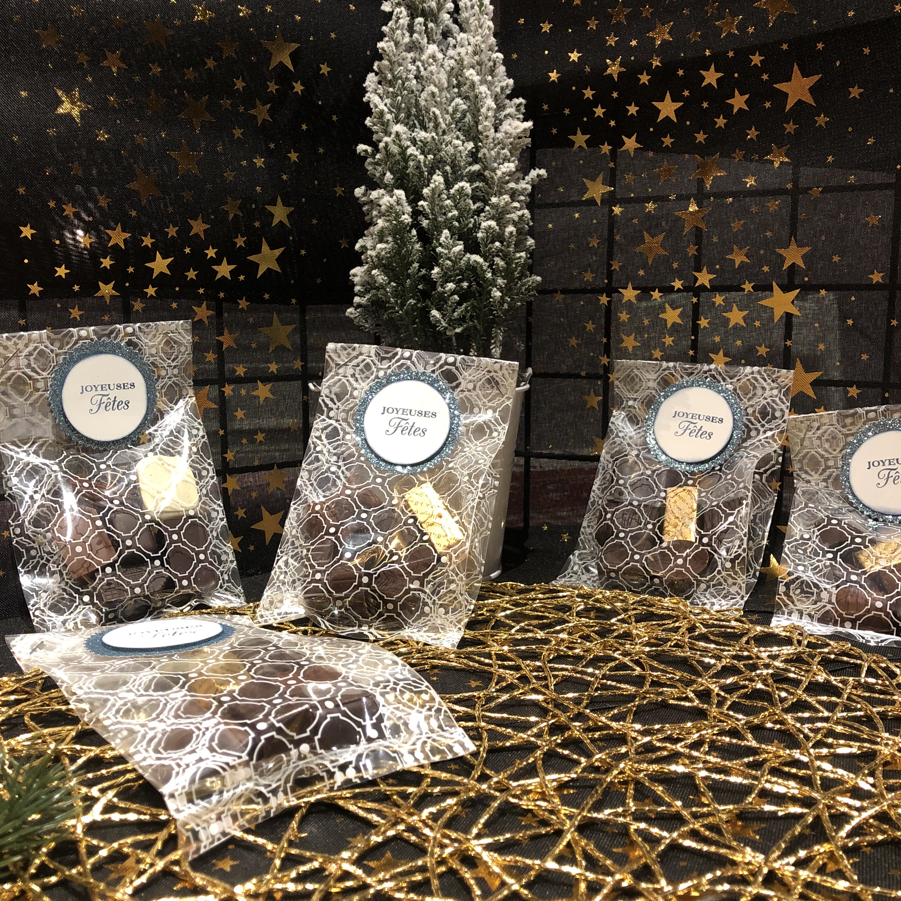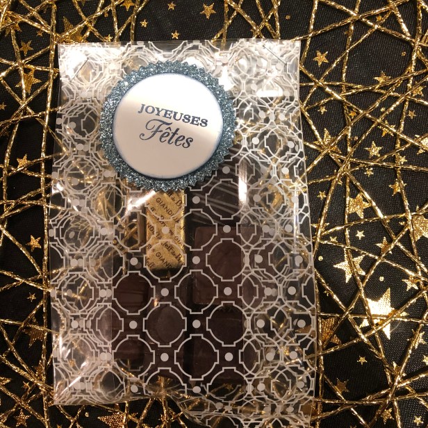 Je m’en suis servie pour offrir des chocolats juste avant Noël et 43 sachets ont été remplis de chocolats. Pour les étiquettes, vous reconnaitrez le beau papier bleu à paillettes .