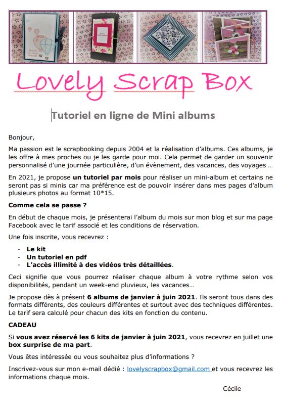 Mini album, tutorielEn 2021, c’est l’année des albums 23 décembre 2020 scrapcec77 Bonjour à toutes, Voici un message à celles qui aiment réaliser des albums et à celles qui souhaitent débuter. Bonne journée. Cécile Partager : Partager sur Facebook(ouvre dans une nouvelle fenêtre) Facebook Imprimer(ouvre dans une nouvelle fenêtre) Imprimer J’aime chargement…