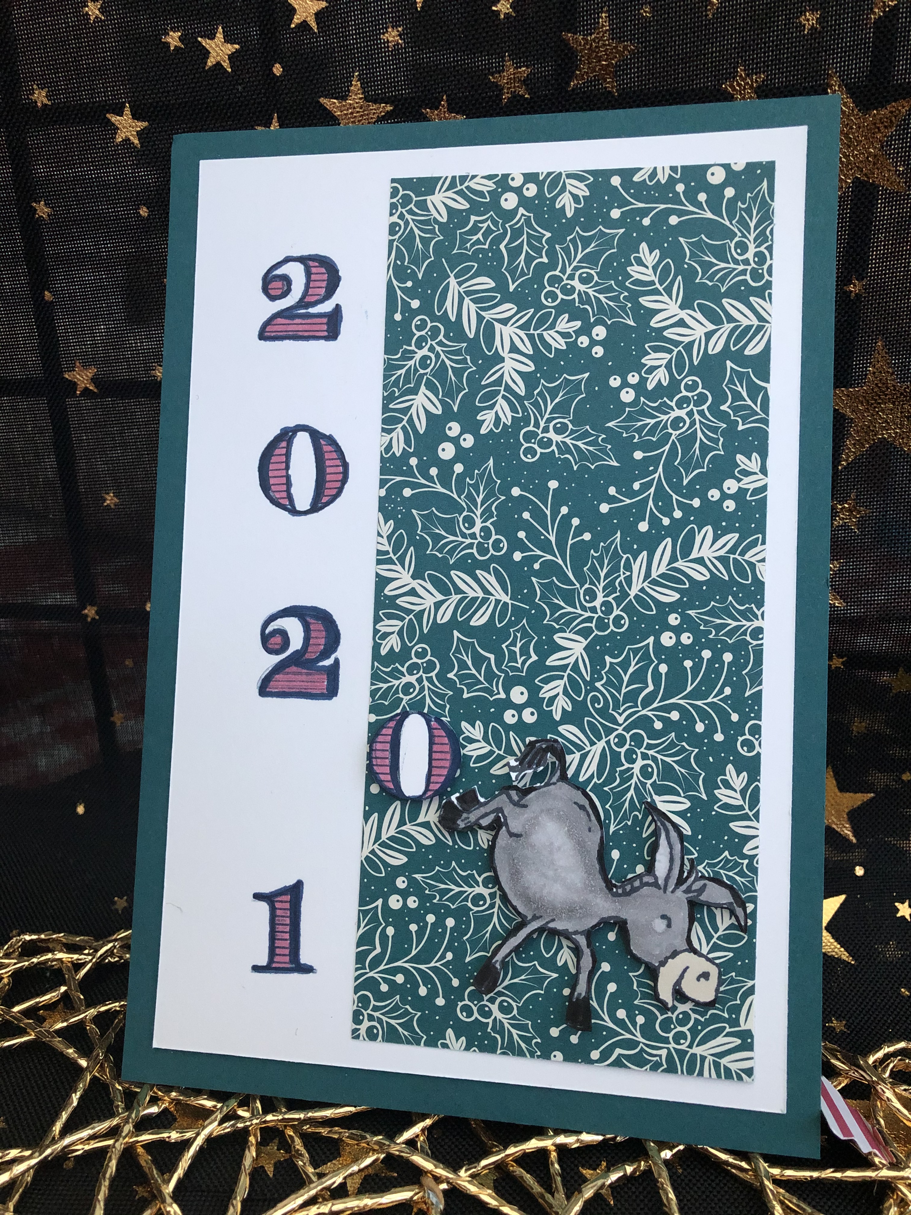 Il s’agit du set de tampons « Gentils Bourriquets » et j’ai repris l’idée d’une démo américaine qui a utilisé ce mignon petit bourriquet qui fait une ruade et qui envoie balader 2020…