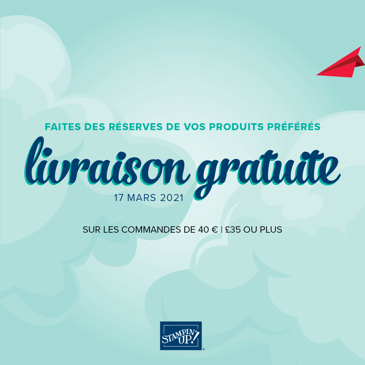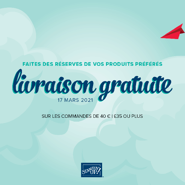Je suis très heureuse de vous annoncer l’offre de la semaine proposée par Stampin Up : les frais de port sont gratuits pour tous type de commandes dont le montant est supérieure à 40 euros toute la journée du mercredi 17 mars.