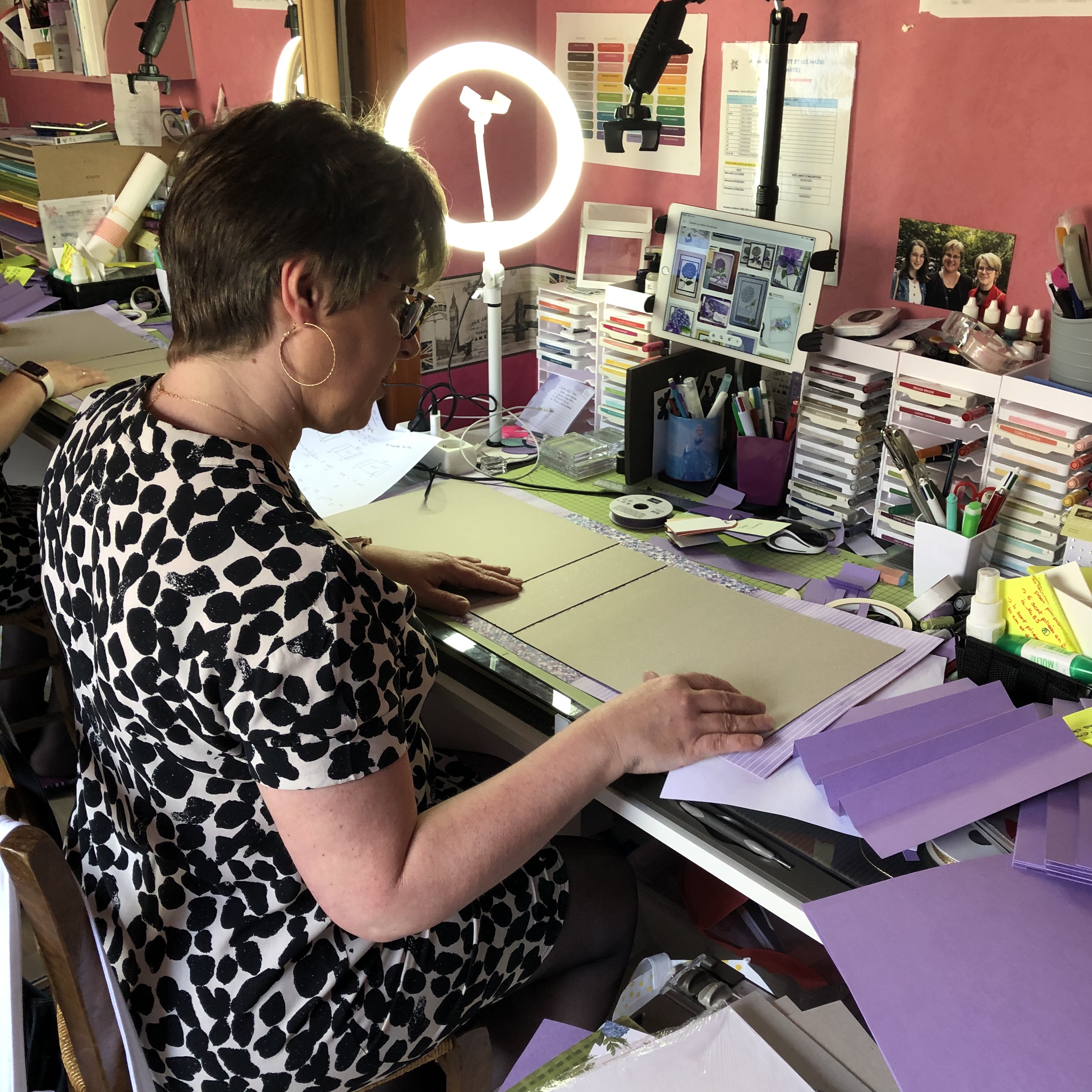 En plus de mon matériel de scrap, les autres indispensables sont : la lampe avec la lumière naturelle pour notamment lorsque je travaille en soirée que les couleurs des papiers ne soient pas dénaturés par une lumière jaune, le matériel pour faire les vidéos face à moi.