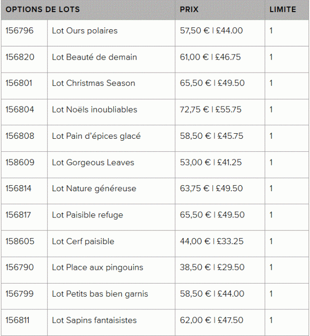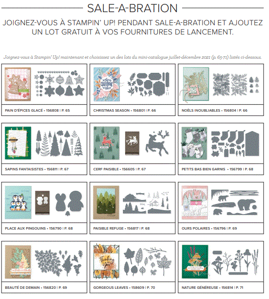 Les personnes qui se joignent à Stampin’ Up ! pendant la période de Sale-A-Bration peuvent sélectionner un lot de la liste ci-dessus pour l’ajouter à leurs Fournitures de lancement sans frais supplémentaires.