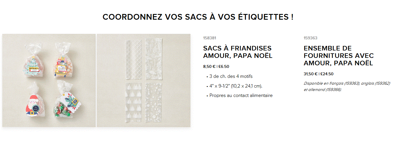 Pour faciliter encore plus votre plaisir d’offrir, pensez à commander les sacs à friandises Amour, papa Noël (vendus séparément) ; des sacs en cellophane propres au contact alimentaire coordonnés aux étiquettes Amour, papa Noël ! Les sacs à friandises sont vendus en paquet de 12, avec 3 sacs de chacun des 4 motifs festifs. Les préparatifs des Fêtes n’auront pas à être un casse-tête cette année ! Mais ne perdez plus une seconde, car ces produits sont disponibles jusqu’à épuisement des stocks.