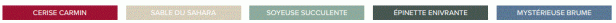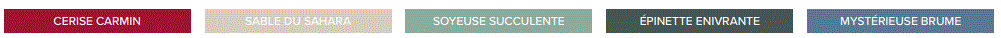 Les couleurs utilisées sont : Cerise Carmin, Sable du Sahara, Soyeuse succulente, Épinette enivrante et Mystérieuse brume