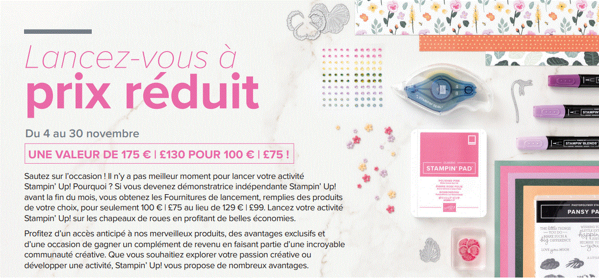 A compter d’aujourd’hui et jusqu’au 30 novembre, Stampin Up vous propose une offre très intéressante pour rejoindre la grande famille des démonstratrices Stampin Up