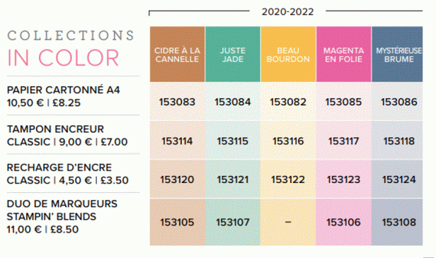 Pour celles qui veulent tout coordonner, je vous ai préparé une liste de tous les produits actuellement en vigueur avec les 5 couleurs In color 2020 2022.