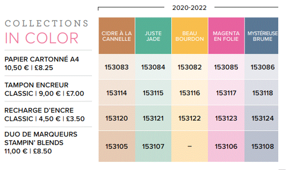 Pour celles qui veulent tout coordonner, je vous ai préparé une liste de tous les produits actuellement en vigueur avec les 5 couleurs In color 2020 2022.