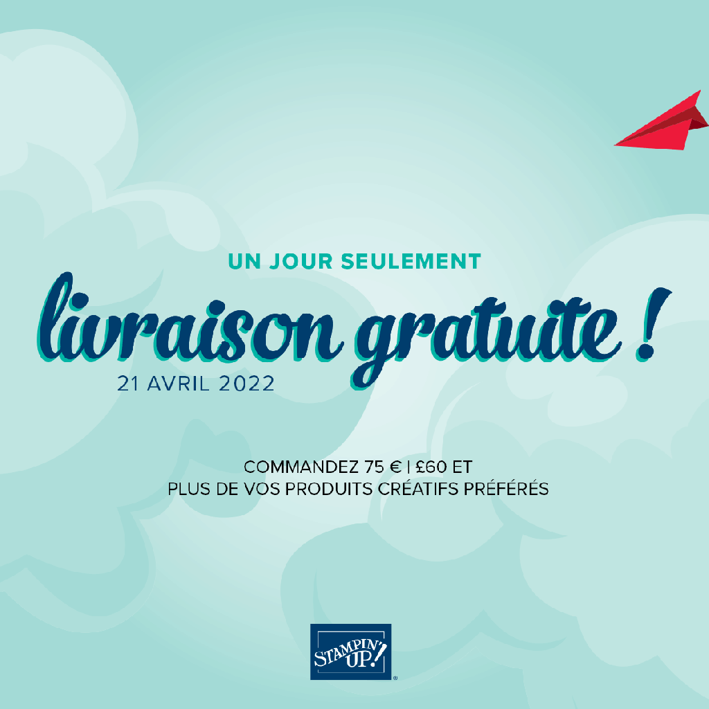 Je suis très heureuse de vous annoncer l’offre de la semaine proposée par Stampin Up : les frais de port sont gratuits pour tous types de commandes dont le montant est supérieure à 75 euros toute la journée du JEUDI 21 AVRIL 2022