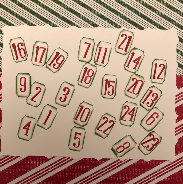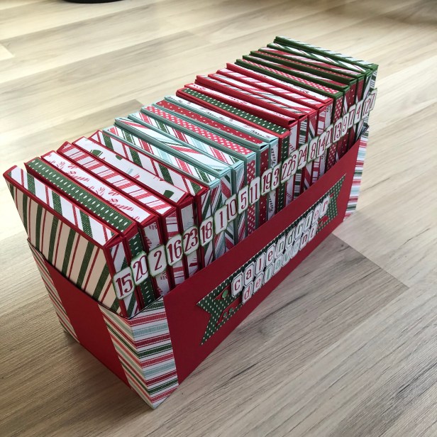 Pour les numéros de 1 à 24 et la décoration de la grande boîte, j’ai utilisé le set de tampons « Alphabest » et la perforatrice « La meilleure étiquette » de Stampin Up.