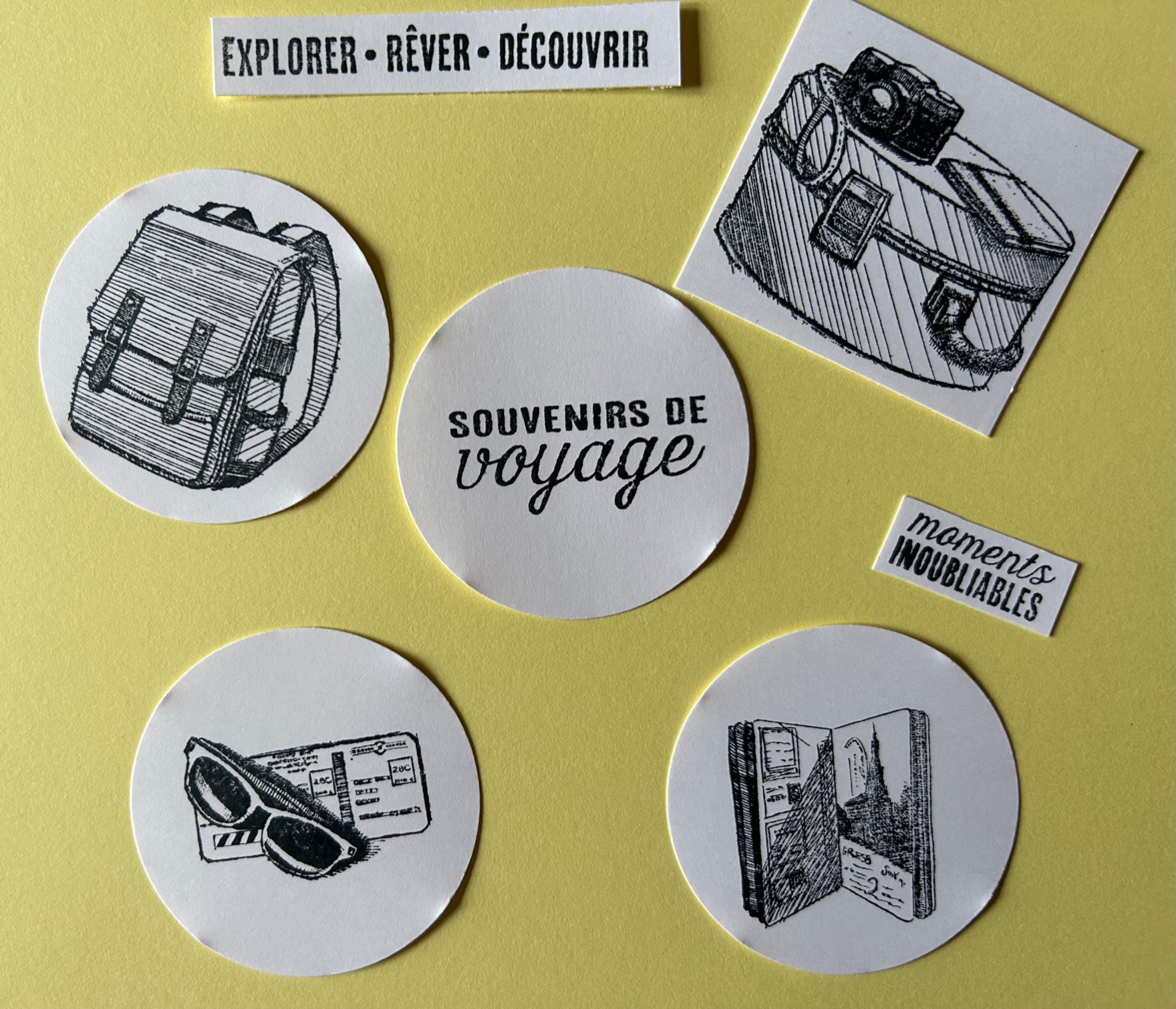 Ces 7 tampons sont parfaits pour la préparation de Road-book, des cartes de vacances et de mini-album de voyage.