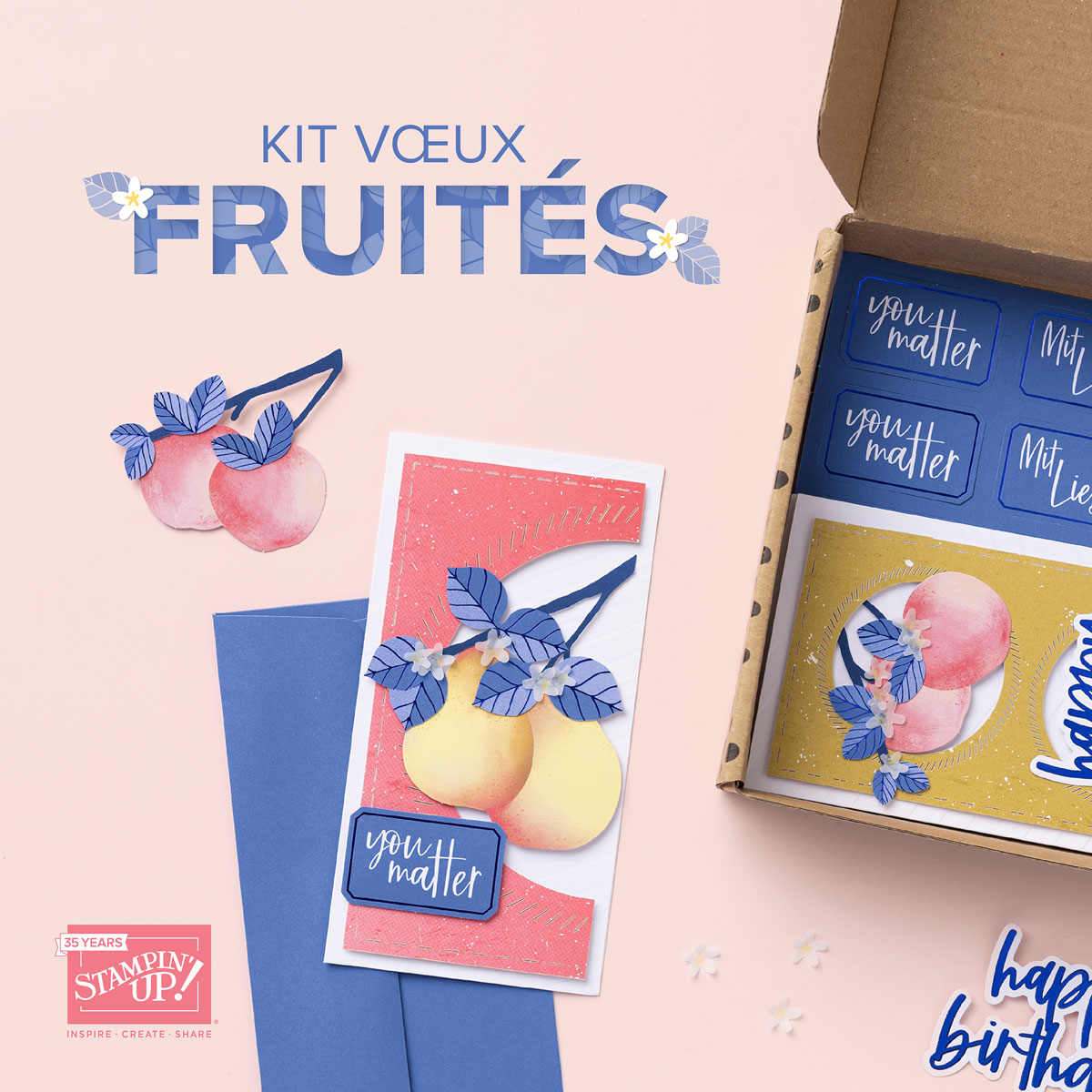 - Bases de cartes gaufrées, découpes imprimées, fruits en vélin, adhésif et ornements