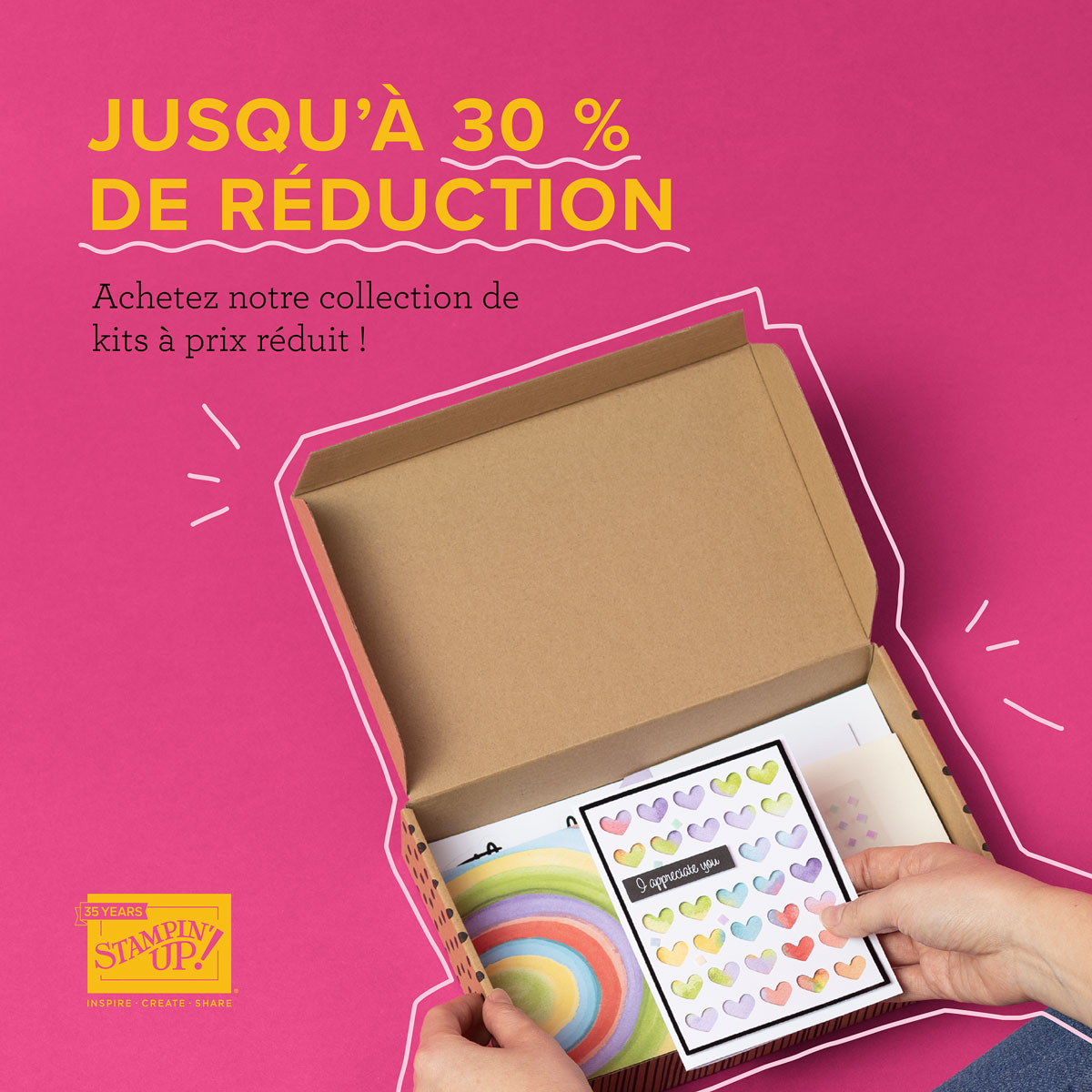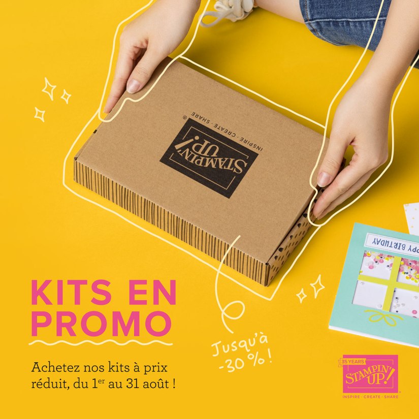 Du 1er au 31 août, Stampin’Up! propose une promotion sur tous les kits qui peut atteindre jusqu’à 30 de réduction.