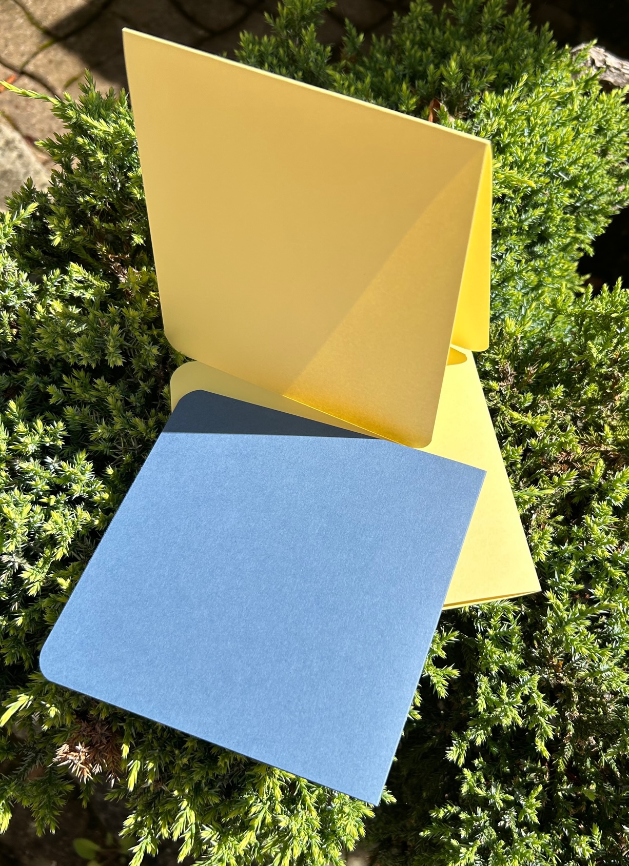 parmi le paquet de 22 feuilles au format 30,5 * 30,5 de PAPIER CARTONNÉ NOUVELLES COLLECTIONS DE COULEURS 2023 (réf. 161711) , 2 feuilles couleur « Mystérieuse brume» et 2 feuilles couleur « Lueur estivale ».
