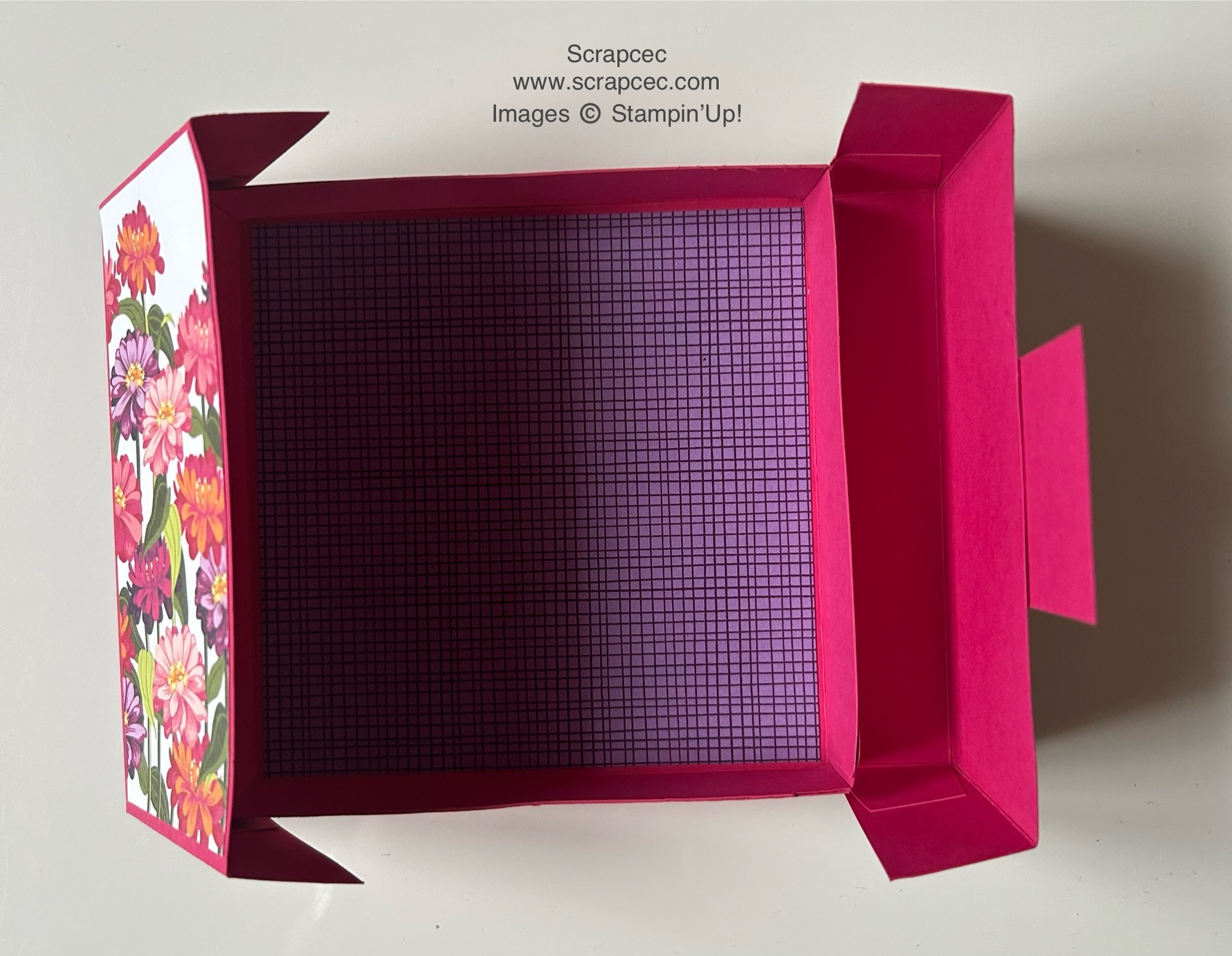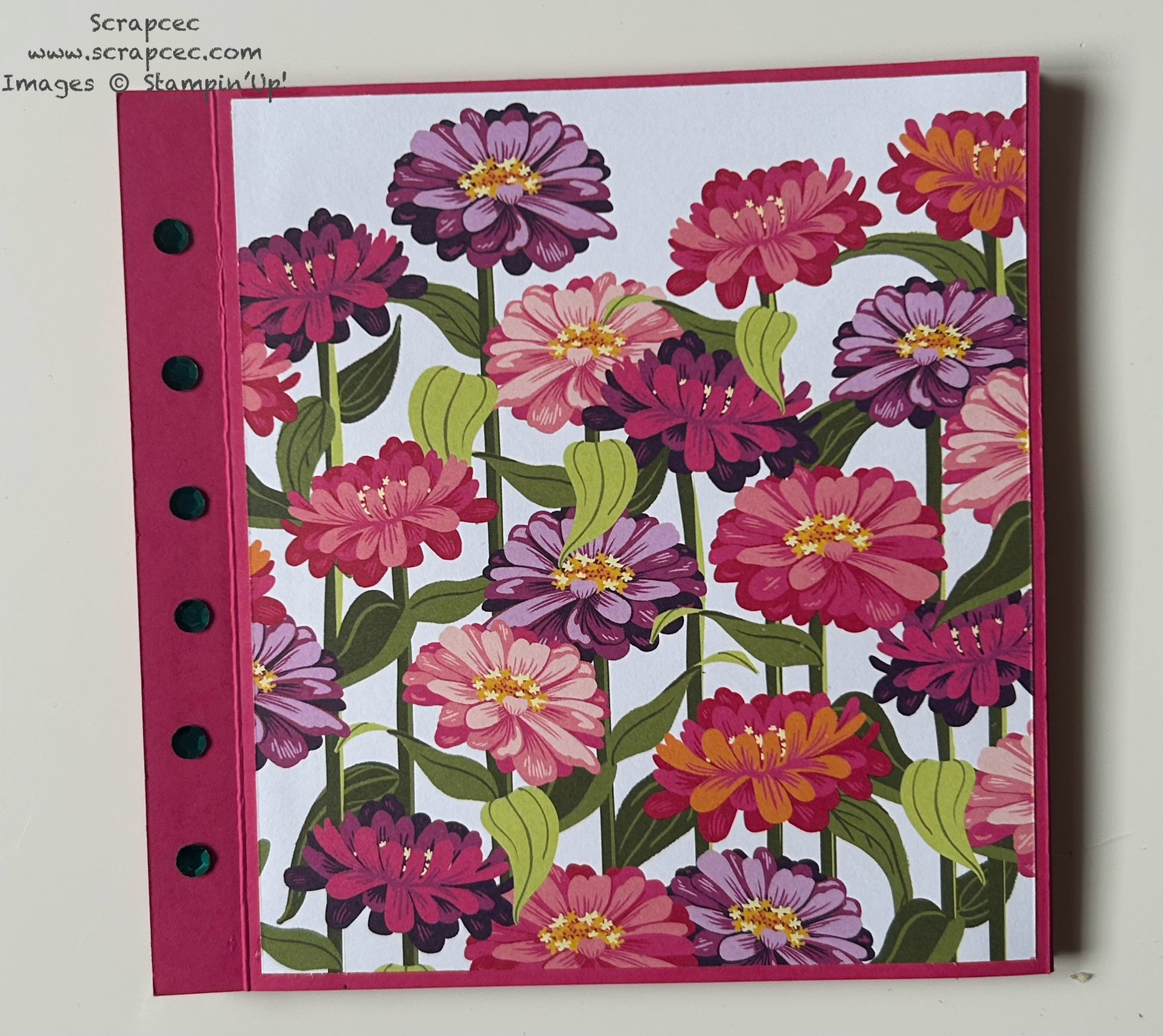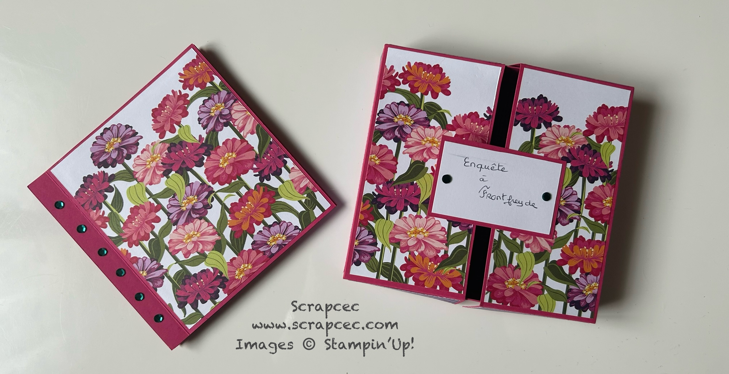 L’album et sa boîte sont réalisés avec la collection « Zinnias en fleurs » et du papier uni « Melon Mambo« .