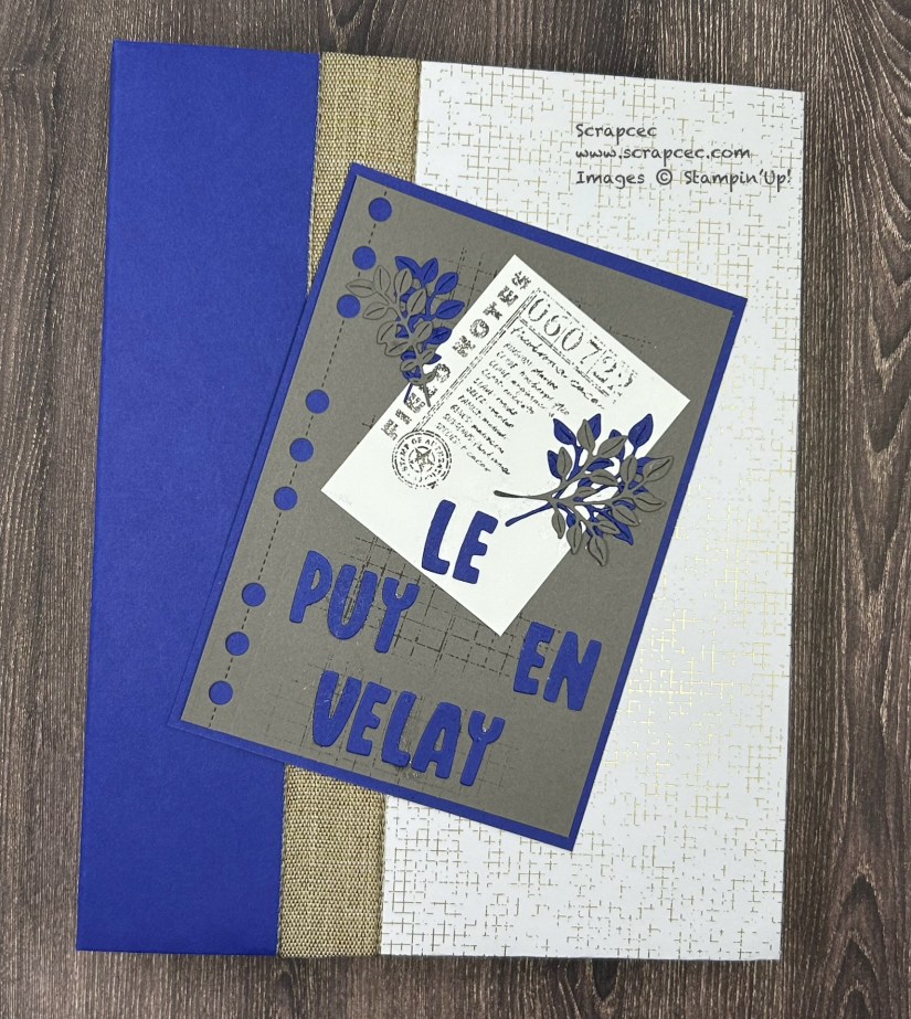 Je l’ai réalisé avec la collection « Douceurs de la nature » et du papier uni « Scène stellaire« . Il met en valeur les photos de la ville du Puy en Velay en Haute-Loire (43).