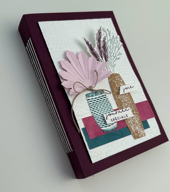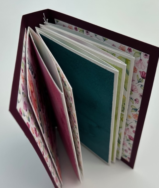 C’est un album de 17 * 12 cm très facile à réaliser. Il contient 4 doubles pages qui se déplient et chaque page est reliée à la couverture par une ficelle.