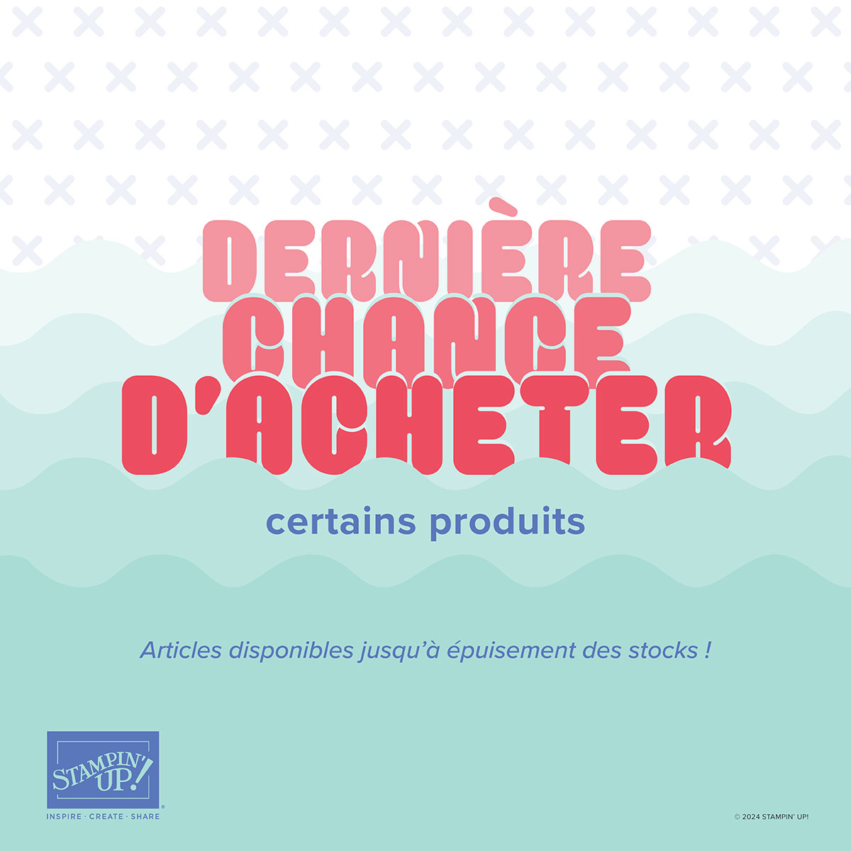 Retrouvez sur le site de Stampin’Up les articles de la dernière chance. Certains sont à prix réduits.