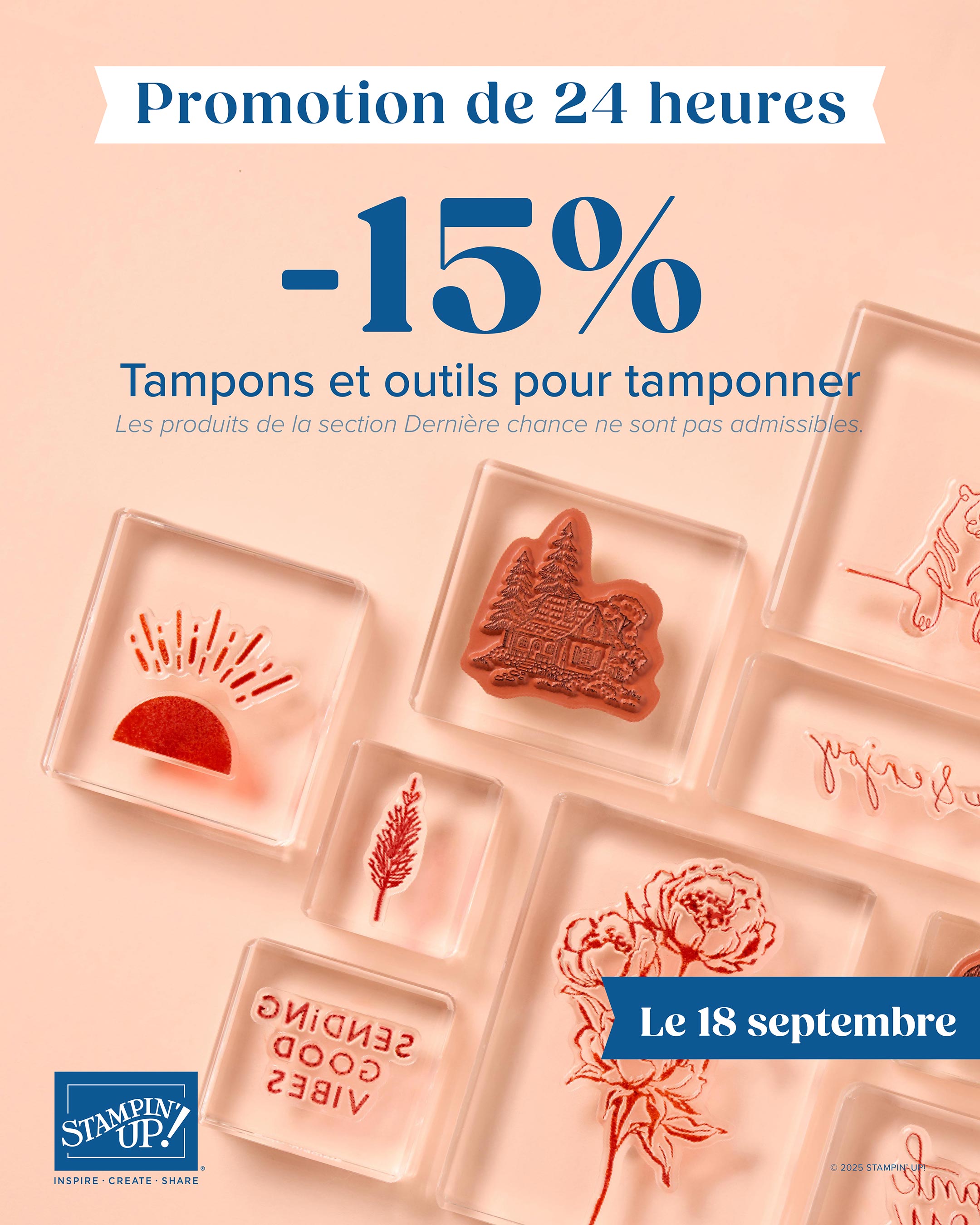 Le 18 septembre, Stampin’Up! propose une réduction de 15% sur tous les tampons et outils pour tamponner.