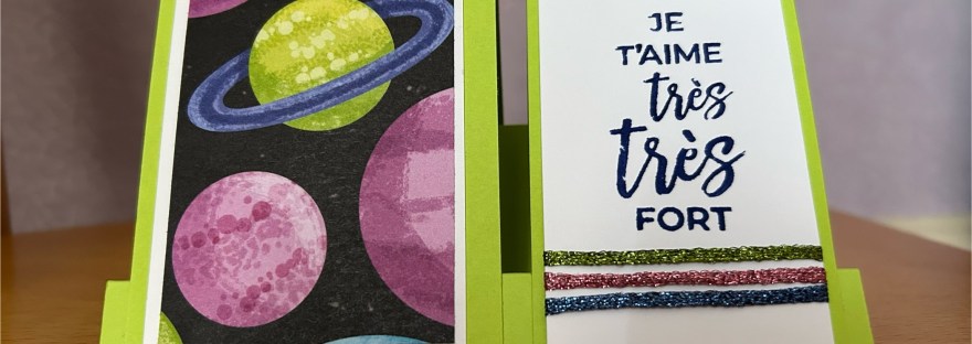 Bonjour, Voici une carte créée pour un anniversaire, une carte double pli Vue de côté Avec un petit espace caché pour écrire un message J'ai utilisé le set de tampons "Une année bien remplie", disponible dans les exclusivités en ligne Bonne journée Cécile