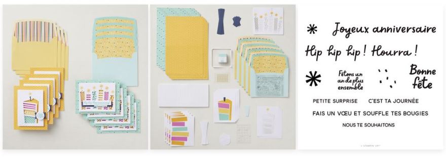 Bonjour, Stampin Up nous propose un tout nouveau kit pour réaliser des cartes d'anniversaire. Le kit contient de quoi créer 8 cartes, 4 de chacun des deux modèles et 8 enveloppes assorties.Comprend des bases de cartes imprimées, des découpes imprimées, de l’adhésif, des ornements et un bloc transparent.Comprend un set de tampons exclusif et un… Lire la suite Des cartes d’anniversaire