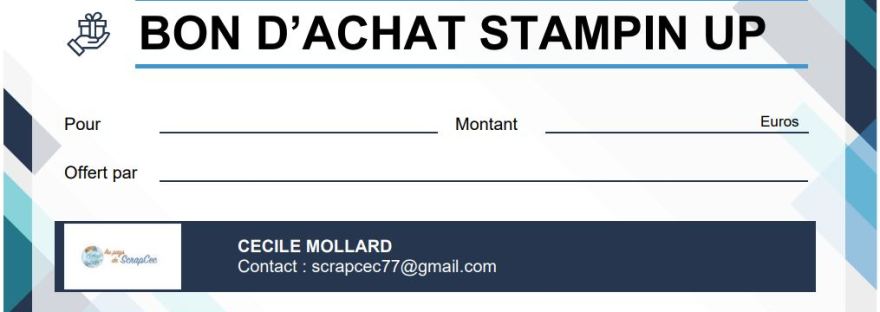 Bonjour à toutes, La fête des mères, c'est dans un mois, le 30 mai. Offrez ou faites-vous offrir des bons cadeaux Scrap... Vous pouvez téléchargez le document ici : bon-cadeauTélécharger Cette offre n'engage que moi et aucune autre démonstratrice Stampin Up ni la société Stampin Up. A très vite Cécile