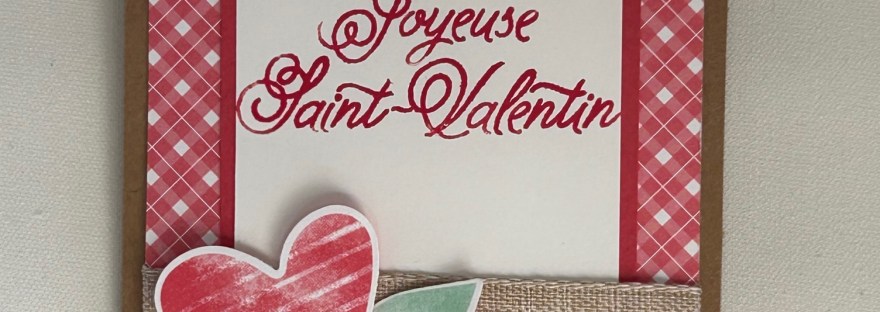 Bonjour, Je vous présente aujourd'hui une carte réalisée pour la Saint-Valentin Les produits utilisés sont : les cartes et enveloppes en kraft Les papiers coordonnées Balade Champêtre et Vichy Champêtre La perforatrice Bouquet de coeurs Le ruban fini naturel une chute de papier A4 sorbet sucré et un ancien tampon texte "Saint Valentin" tamponné avec… Lire la suite Une carte pour la Saint Valentin