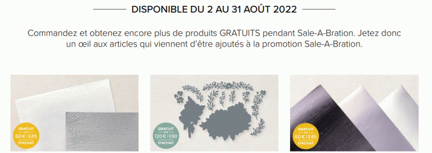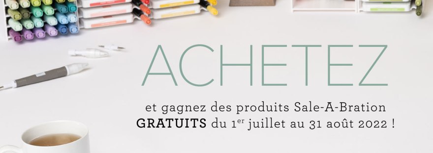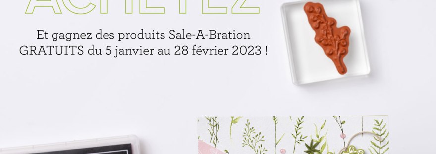 Bonjour, Aujourd'hui démarre la période de Sale-A-Bration (SAB) chez Stampin Up. Pour celles qui ne connaissent pas ce moment si attendu, voici quelques explications. La période de Sale-a-Bration est la période où Stampin Up vous fait plein de cadeaux à chaque commande dépassant 60 euros hors frais de port. Cette seconde période de SAB 2022… Lire la suite Gagnez des cadeaux pendant la SAB
