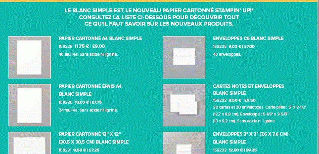 Bonjour, Les produits Blanc simple suivants sont maintenant disponibles : PAPIER CARTONNÉ A4 BLANC SIMPLE (159228)PAPIER CARTONNÉ ÉPAIS A4 BLANC SIMPLE (159230)PAPIER CARTONNÉ 12" X 12" (30,5 X 30,5 CM) BLANC SIMPLE (159231)ENVELOPPES C6 BLANC SIMPLE (159235)ENVELOPPES 3" X 3" (7,6 X 7,6 CM) BLANC SIMPLE (159233) Les papiers blancs : Télécharger N'oubliez pas pour toute… Lire la suite Les papiers blancs sont de retour